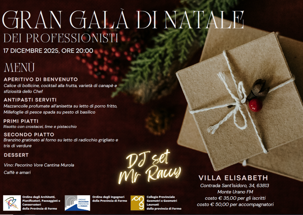 Al termine dell’evento seguirà il “Gran Galà di Natale dei Professionisti” insieme all’Ordine degli Architetti Paesaggisti Pianificatori e Conservatori e il Collegio dei Geometri e dei Geometri Laureati della provincia di Fermo presso Villa Elisabeth – Contrada Sant’Isidoro, 34, 63813 Monte Urano (FM), con intrattenimento musicale con DJ set Mr. Raccy.